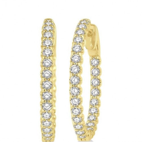 A dazzling pair of hoop earrings, these draw instant attention, as they are showy and well-designed. The earring is closely embellished with bright round cut diamonds that are laid out in a neat row. There is a total of 52 prong set round cut diamonds, 26 diamonds each, adorning the pair of earrings. Scalloped edges all along the border on both sides of the earrings, give them a beautiful finish. The hoop earring is fashioned in 14 karat white gold. Total diamond weight is 1 1/2 ctw.