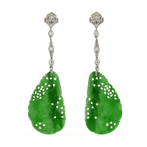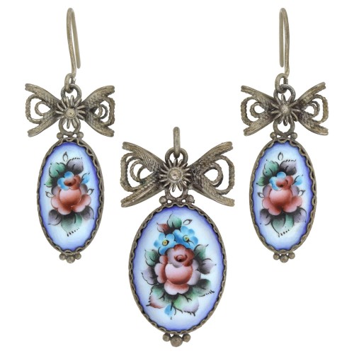 Art Deco Sterling Hand-Painted Porcelain Earrings + Pendant Set