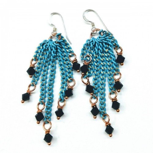 Turquoise Tassel Chain Black Crystal Earrings by Alexa Martha Designs