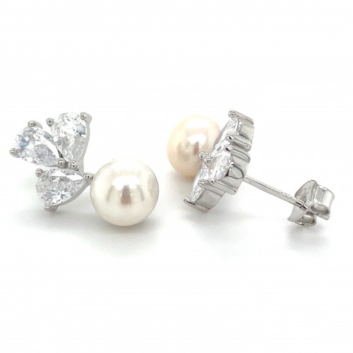 Sterling Silver Triple Pear Cz & Pearl Earrings