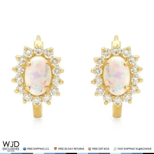 Framed in the fiery light of 0.70Ct round CZs, these fire opal huggie hoop earrings showcase their famous color play. Made of solid 14K yellow gold, the earrings measure 13mm in height. The CZ stones emit every shade of light that a natural diamond would emit, with radiance and fire equivalent to, if not superior to, a natural diamond of VVS1 clarity and D color with an excellent cut.