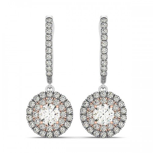 A beguiling pair of halo style earrings with brilliant diamonds and a classic cushion outer shape. Made of 14k white and rose gold, these beauties come with push backs.