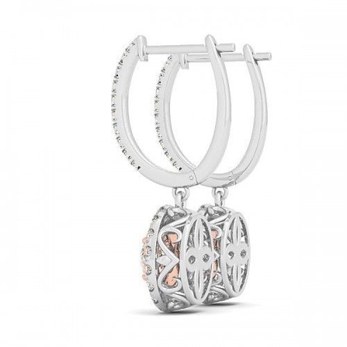 Delicate round diamonds form a brilliant double halo style on these diamond drop style earrings. Showcasing fleur de lis filigree side detailing, these 14k white and rose gold earrings come with hinge back locks.