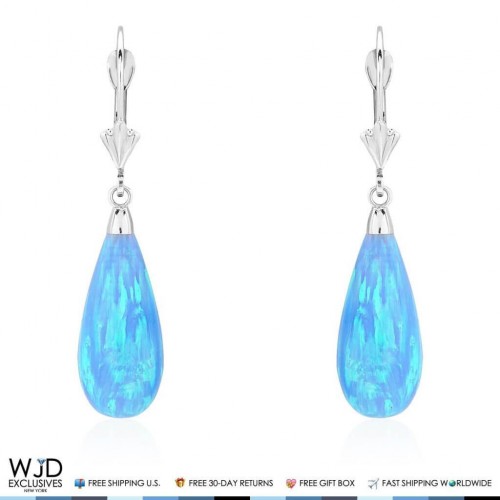 These charming tear drop-shaped sky blue opal dangle earrings are crafted from solid 14K white gold. Measuring 1.5 inches in height, they are secured with leverback fastenings for a comfortable fit.