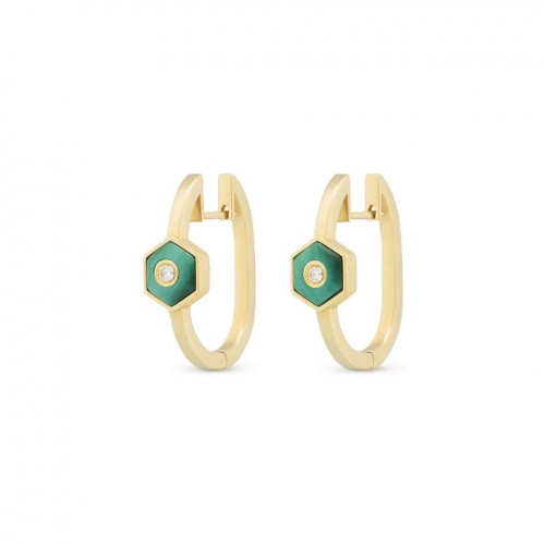18kt Yellow Gold Miseno Baia Sommersa Hoop Earrings Containing .07 Carats Of Round Brilliant Cut Diamonds Bezel Set Into Malachite. The Earrings Measure 24mm x 19mm.