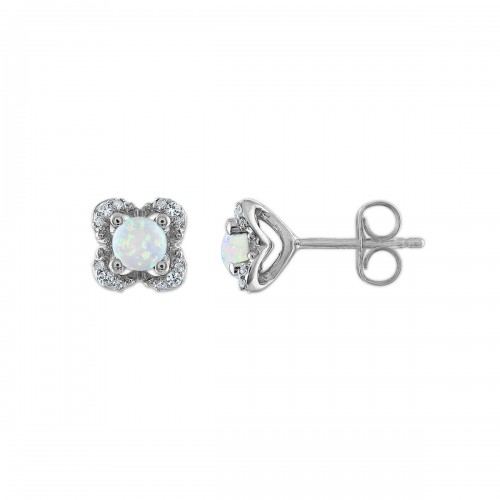 4MM Round Opal and White Sapphire Birthstone Flower Halo Earrings in Sterling Silver