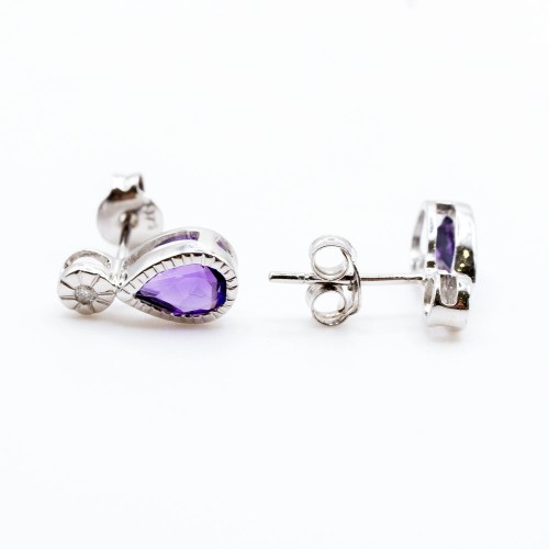 9ct White gold pear cut amethyst and round brilliant cut diamond drop earrings.