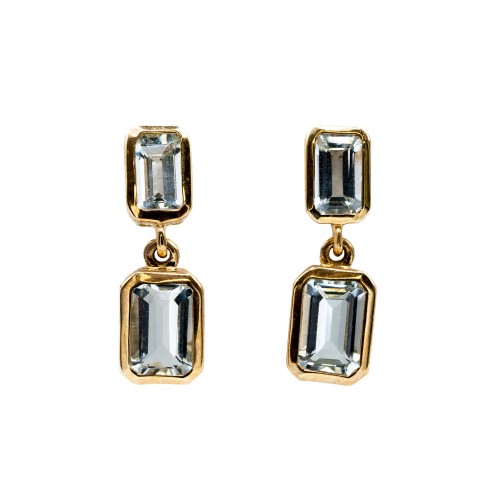 9ct Yellow gold rubover set aquamarine drop earrings.