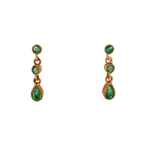 9ct yellow gold 2 x 1 round & pear shaped Emeralds drop earrings with mili-grain beaded edging.
