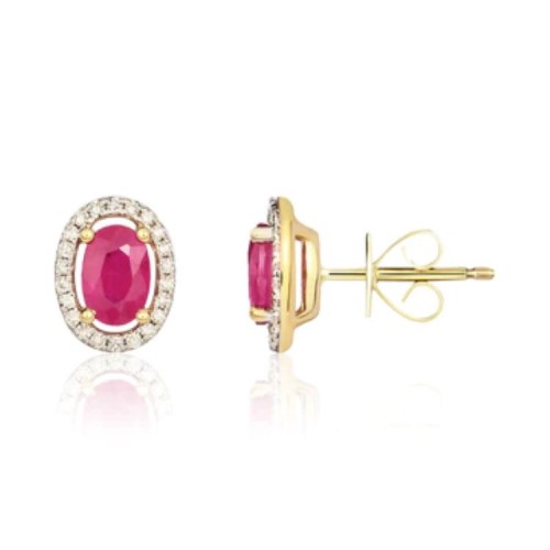 9ct Yellow gold oval cut 0.91ct ruby and round brilliant cut diamond cluster stud earrings.