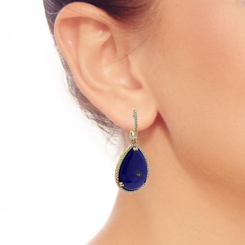 These beautiful pear shaped lapis lazuli drop earrings sparkle with the glitter of diamonds studding the yellow gold setting.