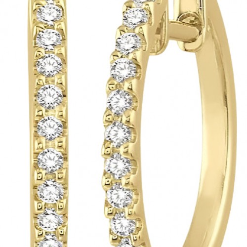 A pair of classic style hoop earrings; these easily make for a quick choice. They are simple, elegant and eye-catching and can be anyone’s favorite. The hoops are beautifully accentuated with 26 prong set round cut diamonds, 13 on each earring, highlighting the earring front. A huggie back closure offers ease of use. Constructed in rhodium finish 10 karat white gold, the hoop earrings are a great addition to any jewelry box. Total diamond weight is 1/5 ctw.