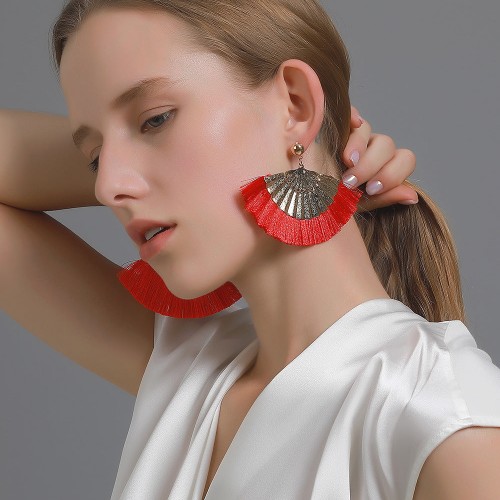 E1676 Large Gold Fan Multi Color Tassel Earrings