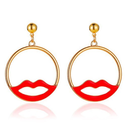 E218 Silver Hoop Red Lips Earrings