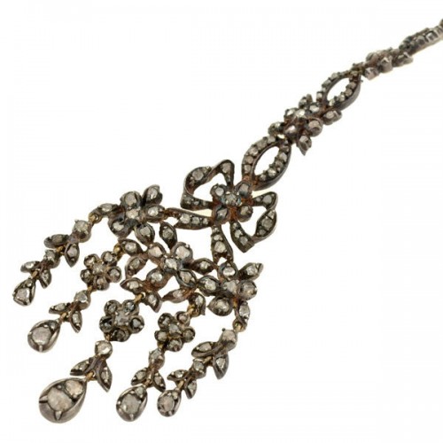 An exquisite pair of drippy chandelier earrings from the Georgian era (ca1830)! These incredible earrings are made of silver-topped gold and encrusted with sparkling old Rose Cut diamonds. Each earring has a long, elegant design comprised of delicate diamond clusters, floral petals, and open swirls. All of the rose cut diamonds are belcher set set and foil-backed. Five strands of diamond teardrop links swing freely from the bottom, and a diamond-lined bow rests directly above. The reverse side reveals a yellow gold back engraved with delicate flowers, a lovely and feminine touch. The earrings hang from gold posts at the top, and their hinged design gives them lovely movement when worn. Despite their substantial size, the earrings are lightweight and comfortable to wear. Georgian jewelry is very collectible and these earrings are particularly impressive! They would look stunning worn on special occasions and would make an incredible addition to any Georgian collection!