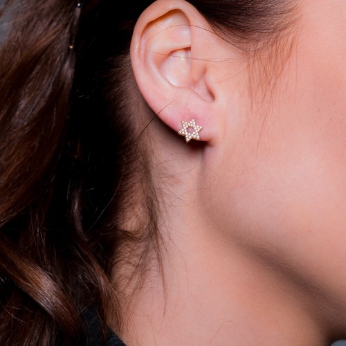 | The Star of David or Magen David (Shield of David) is an ancient and iconic symbol. Symbolising new beginnings this beautiful star holds so much meaning to so many. Measuring approximately 9.14mm wide these earrings are crafted out of 18ct Gold Plated Sterling Silver. |