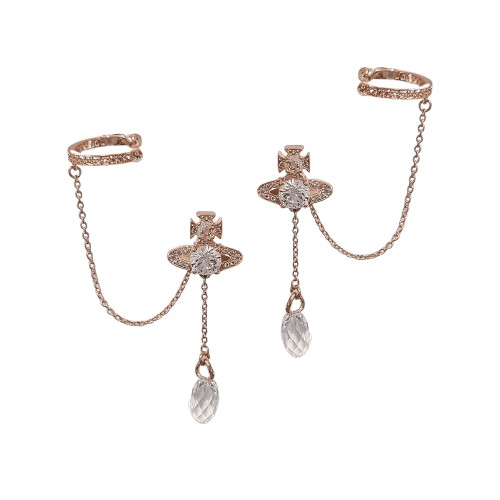 The unique Henriette Earrings are guaranteed to catch the light, scattered with sparkling cubic zirconia crystals and featuring the classic Vivienne Westwood Orb and dangling stone at the front. The cuff is removable enabling these earrings to be worn in multiple different ways. Dimensions: H 9cm x W 1.3cm, Orb: H 1cm x W 1.3cm. Metal: Brass. Presented in official Vivienne Westwood packaging.