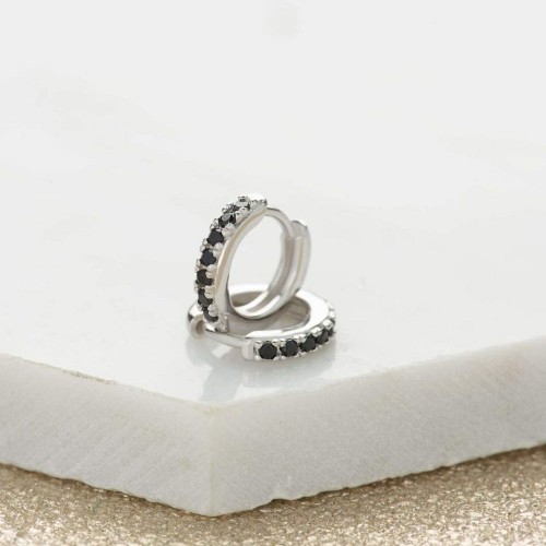 These gorgeous small huggie hoop earrings are decorated with black cubic zirconia stones. Suitable for day or evening wear these earrings are also comfortable enough to sleep in. This earring can be paired with upper ear or mid ear piercings. Please be aware these earrings are small and dainty, and close fit to the ear, these earrings may not fit larger lobes, if the piercing is set higher on the lobe. Presented in Official Scream Pretty packaging. Metal: Sterling Silver. Dimensions: 11mm diameter, 7mm internal diameter, 2mm width. Earring Type: Small Huggie with hinged click clasp. Presented in official Scream Pretty packaging.