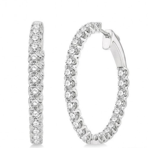 A dazzling pair of hoop earrings, these draw instant attention, as they are showy and well-designed. The earring is closely embellished with bright round cut diamonds that are laid out in a neat row. There is a total of 60 prong set round cut diamonds, 30 diamonds each, adorning the pair of earrings. Scalloped edges all along the border on both sides of the earrings, give them a beautiful finish. The hoop earring is fashioned in 14 karat yellow gold. Total diamond weight is 3 ctw.