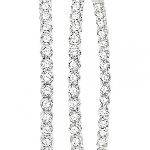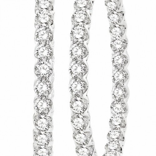 A dazzling pair of hoop earrings, these draw instant attention, as they are showy and well-designed. The earring is closely embellished with bright round cut diamonds that are laid out in a neat row. There is a total of 42 prong set round cut diamonds, 21 diamonds each, adorning the pair of earrings. Scalloped edges all along the border on both sides of the earrings, give them a beautiful finish. The hoop earring is fashioned in 14 karat white gold. Total diamond weight is 8 ctw.