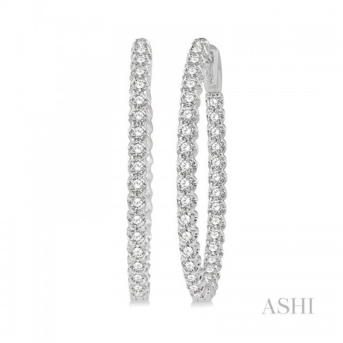 A gorgeous pair of Lovebright diamond hoop earrings, these can make any woman fall in love with them instantly. Each of the earrings feature 14 circular mounts, the front facing 7 of which are embellished with sparkling round cut diamonds. The 7 mounts on each earring is adorned with an invisible set round cut diamond in the center, a total of 14 on both earrings. The center stone is haloed by 8 small invisible set round cut diamonds each, a total of 112 diamonds on both earrings together. Styled in 14 karat yellow and white gold, these earrings add panache to any ensemble. Total diamond weight is 1 1/2 ctw.