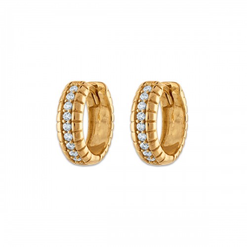 These elegant huggie earrings are crafted in 18kt gold vermeil over sterling silver. Each earring features 9 round lab-grown diamonds totaling 18 stones at 1/5 carat weight, delicately set between scalloped edges that add texture and vintage-inspired charm. A perfect blend of sparkle and sophistication, these versatile huggies are ideal for everyday elegance or special occasions.