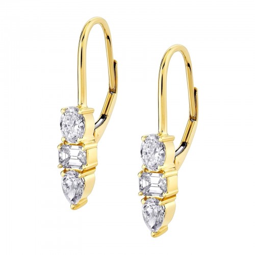 18K yellow gold diamond fashion earrings. The earrings feature two oval, two emerald cut, and two pear shape diamonds weighing 1.35 ctw. Designed by Michael M.