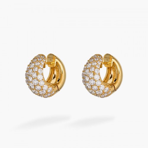 18K yellow gold huggie earrings from designer Piranesi. Pave set earrings featuring 5.71 carats of white diamonds in a raised dome style to catch light from every angle. Snap close backs to secure to your ear.