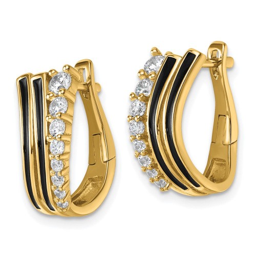 Sterling Silver Gold-tone Black Enamel and CZ Hinged Hoop Earrings