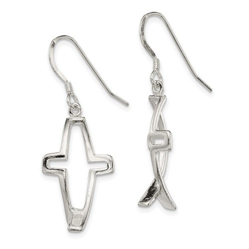 Sterling Silver Polished Cross Ichthus Dangle Earrings