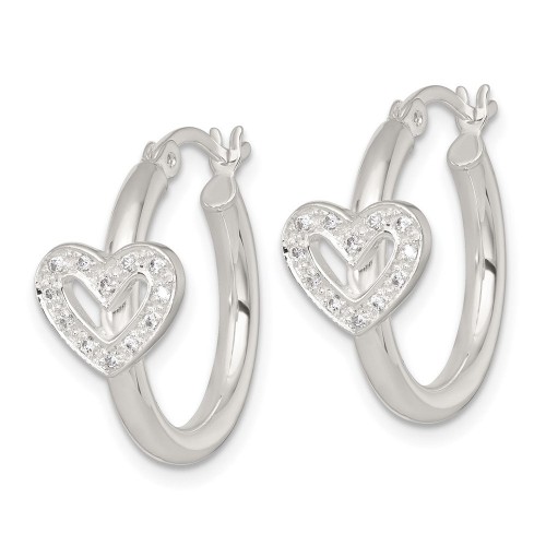Sterling Silver Polished CZ Heart Round Hoop Earrings