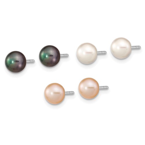 Sterling Silver Rhodium-plated 6-7mm White, Black and Pink Button Freshwater Cultured Pearl Set of 3 Post Earrings
