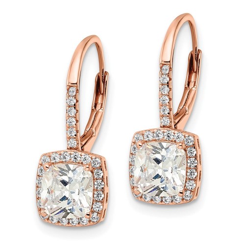 Sterling Silver Rose-tone Polished Princess Cut CZ Halo Leverback Earrings