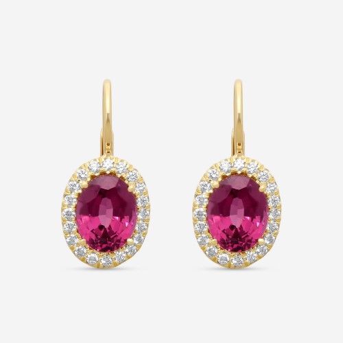 Bold and captivating, these 18K yellow gold earrings feature oval rhodolites totaling 4.85 carats, accented by 0.41 carats of sparkling fancy-colored white diamonds. The warm, rich tones of the gemstones paired with the brilliant diamond accents create a striking and sophisticated statement piece.