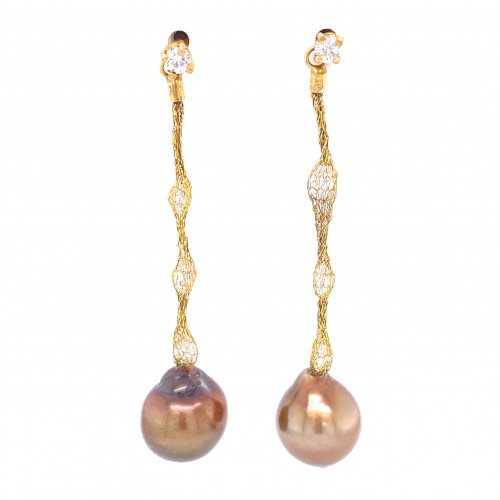 Yellow Pearls & Cubic Zirconia Golden Mesh Earrings